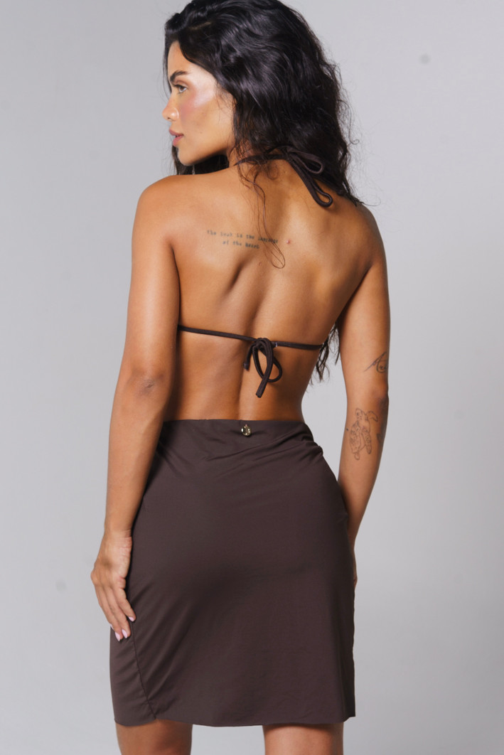 O design com drapeado frontal e amarração estratégica cria um efeito visual refinado e alonga as pernas, enquanto a fenda traz movimento e sensualidade na proporção perfeita. Ideal para compor com biquínis, tops e regatas, é aquela peça-chave que transita da praia ao pós-praia com naturalidade.